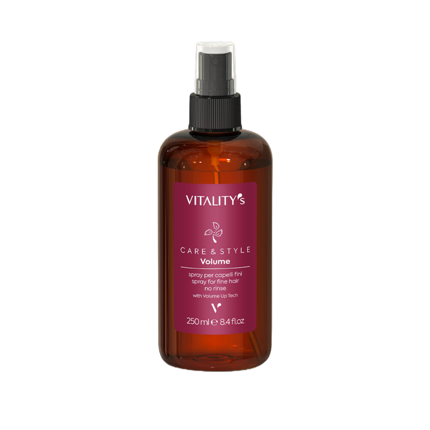 Introducing Vitality's Care & Style volume no-rinse spray for fine hair; giving support to fine hair for lightness and bounce.